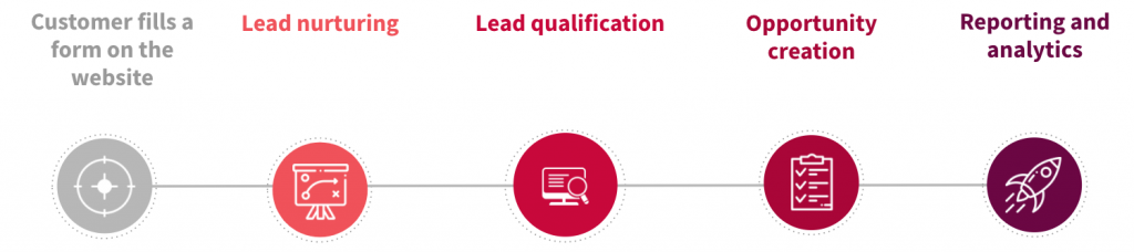 Automated lead management means that the customer’s contact request through a web form is processed and stored into a marketing automation system or customer relationship management system, more commonly known as CRM. After this, it is possible to nurture the lead and eventually pass it to sales if the lead meets the right criteria.
