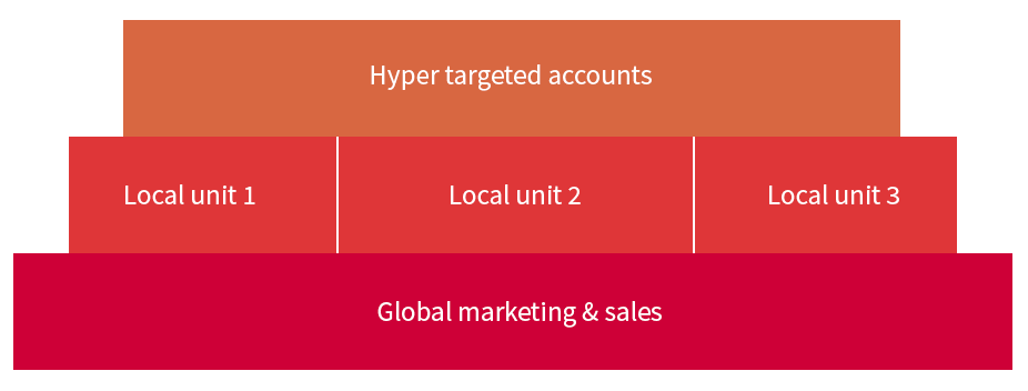 Global marketing teams provide the baseline fundament of marketing automation, giving local organizations a defined toolkit to execute on local campaigns. Hyper-targeted personalized accounts are managed on another level on top of the structure.