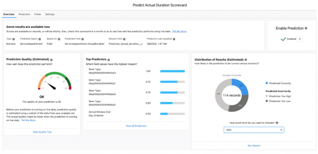 Creating a new prediction or recommendation with Einstein is not a time-consuming process; results can be gained from these solutions quickly and efficiently. Having a good understanding of Field Service objects and data is vital for setting up a good prediction or recommendation because the quality of the prediction results depends strongly on the quality of the data.